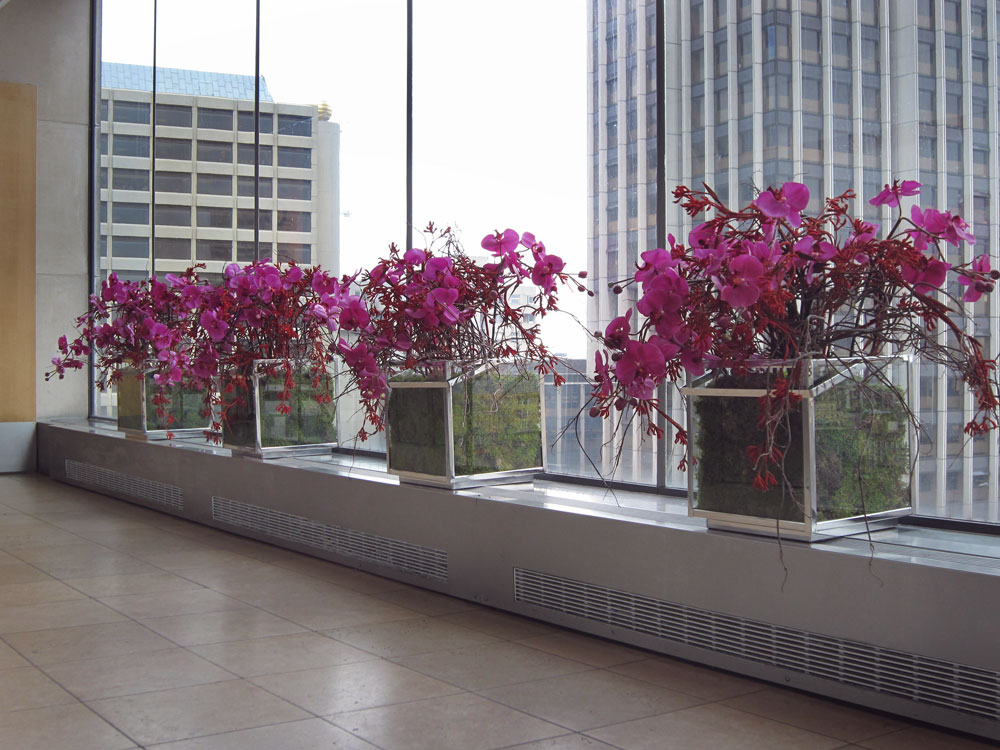 cerise phalanopsis and willow in large, glass cube vase, Oxo Tower, London